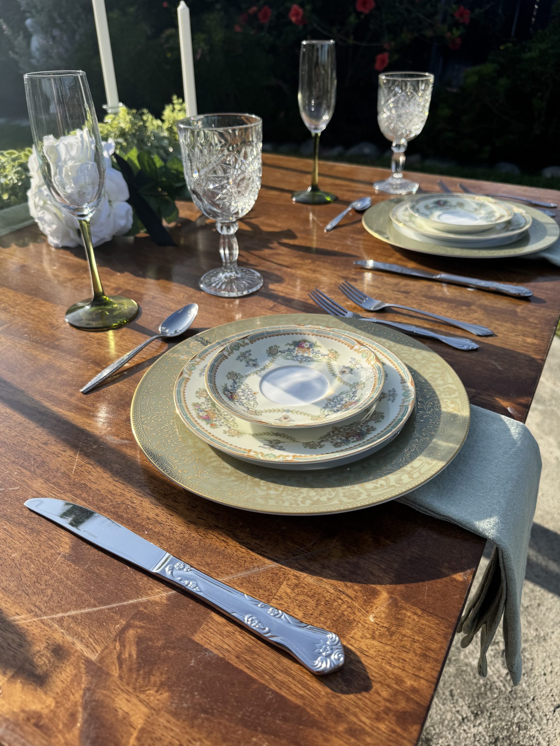 At Vanessa Anthony, we believe the table is the heart of any celebration. Our thoughtfully curated collections of vintage dishes, glassware, and serving pieces are designed to add warmth, charm, and character to your special moments. Whether you're hosting an intimate dinner, a garden party, a shower, or a grand wedding, our beautiful pieces help create unforgettable moments that last a lifetime.